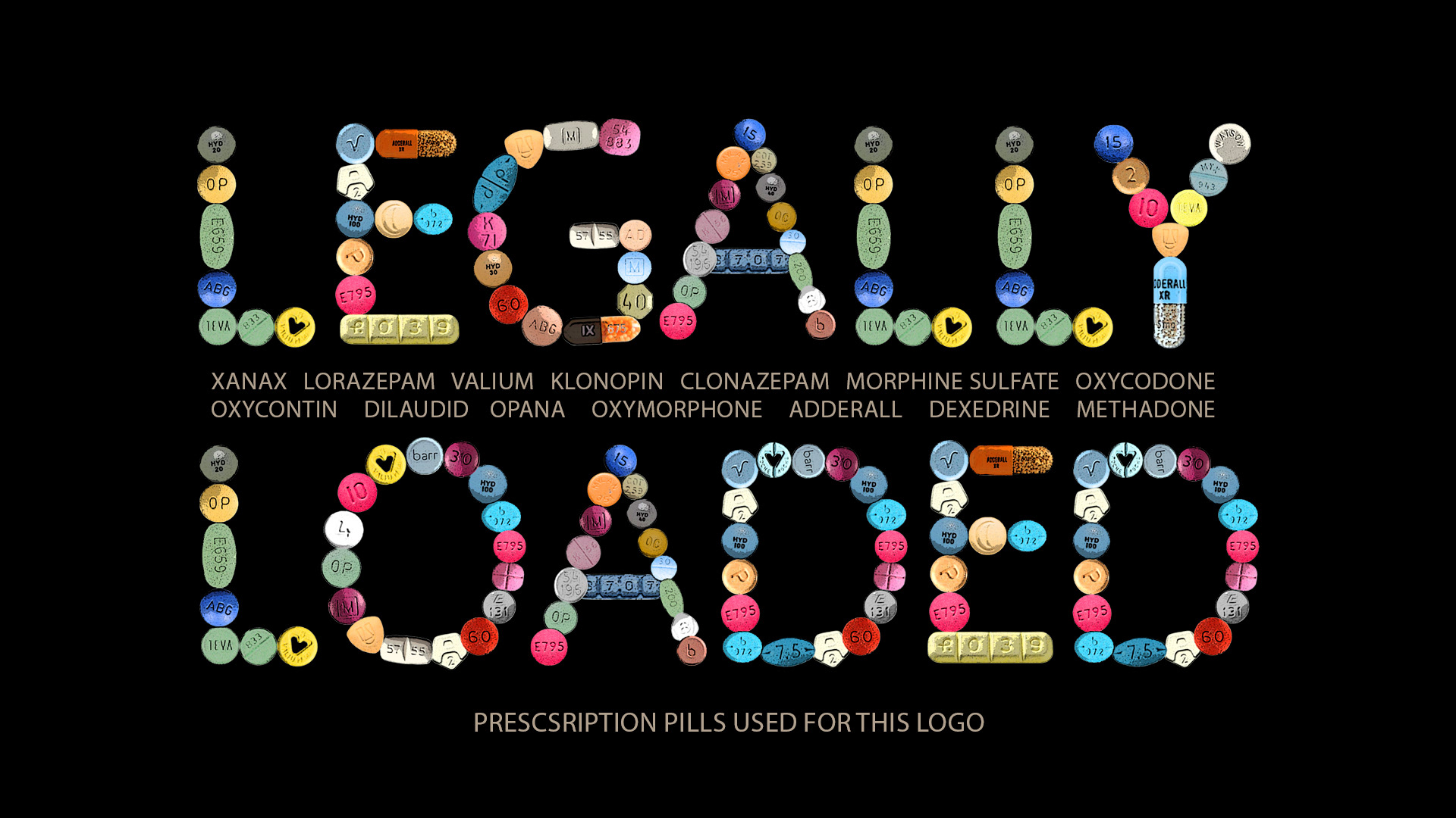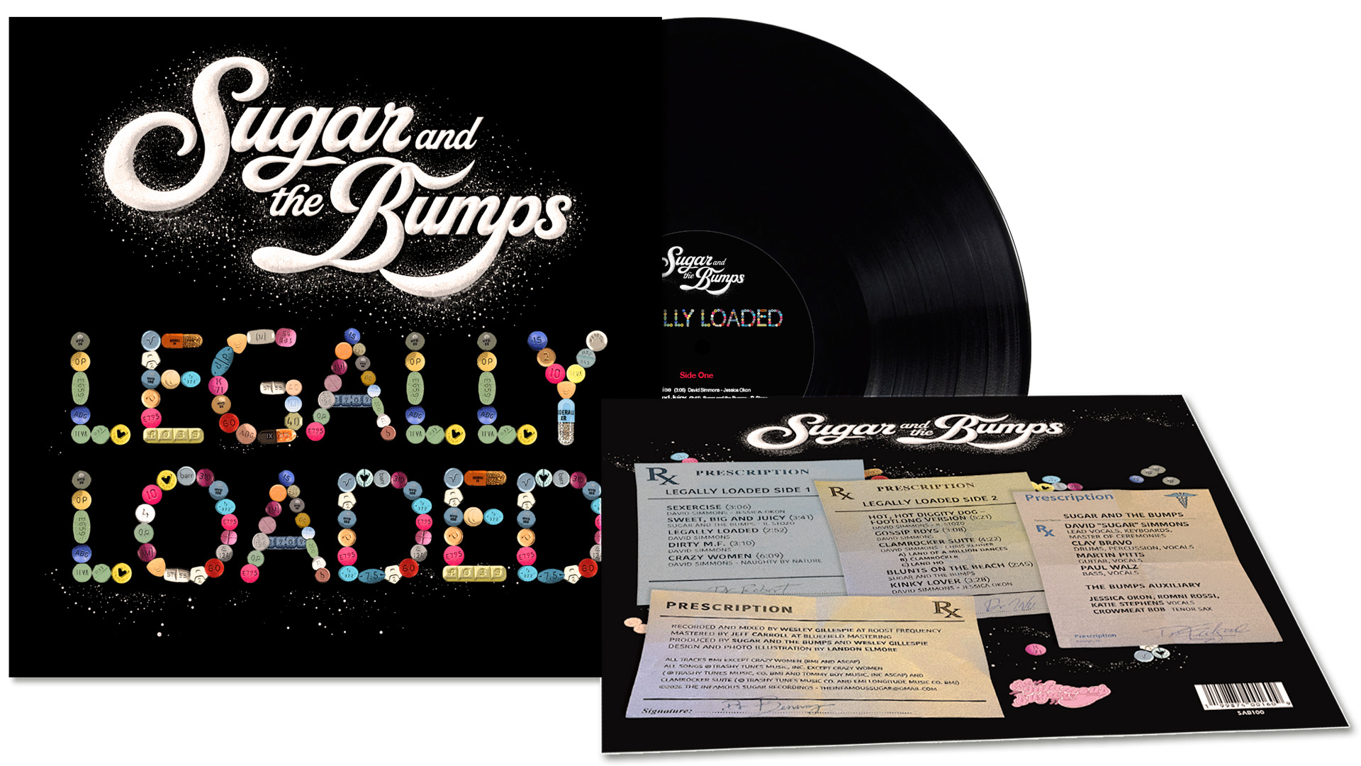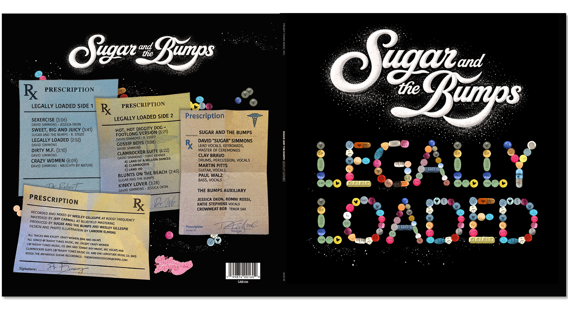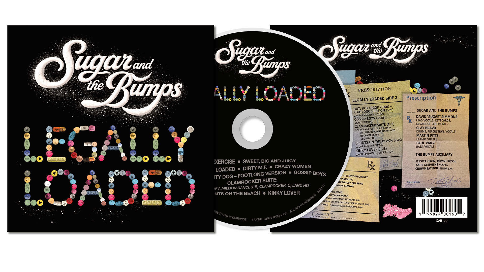 Album design depicts the title "Legally Loaded" in letterforms made of prescription pills. The back cover information appears on individual script pads, signed by famous rock-n-roll doctors including Dr. Feelgood and Dr. Wu.